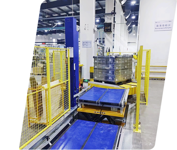 基于现阶段市场需求新开发的一款配套流水线的自动码垛立体库,适用于托盘码垛之后进行缠绕膜包装的货物,使用db真人旗舰·(中国)集团智能生产的缠绕包装机可以起到防止产品包装时散包,提高包装效率。